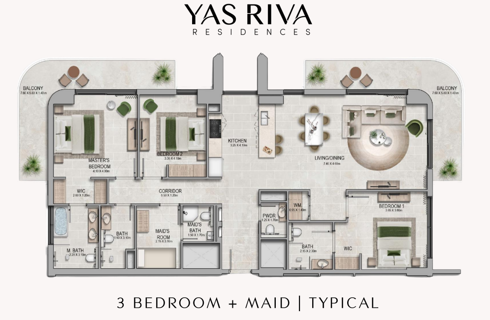 3 Bedroom + Maid Expansive family-oriented layout with maid’s room, large living and dining space, and panoramic outdoor views.